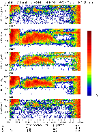 - Auroral oval crossing in postmidnight-morning sector. In the middle - plasma sheet protons, at the sides - ring current protons. The five panels - count rates at different directions to the satellite rotation axis.