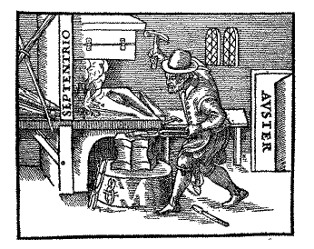 Figure 3 A blacksmith pounding a cooling bar of steel while it is aligned in the north-south (SEPTENTRIO-AUSTER direction. The bar captures some of the Earth's magnetism (De Magnete, book III, chapt. 12).