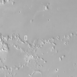 The white box in the picture above left shows the location of one of the MOC images of possible psuedocraters on Mars. The white box is drawn upon a MOC red wide angle context image acquired at the same time as the high resolution view, shown on the right above. Located in northwestern Amazonis Planitia near 24.8°N, 171.3°W, both the context image and high-resolution view are illuminated from the lower left. The high resolution view shows several possible psuedocraters (cone-shaped features with holes or pits at their summits) that occur on top of a rough-textured lava plain. The context frame covers an area 115 km (71 mi) across, the high-resolution view is 3 km (1.9 mi) across.