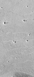 The surface shown here (above right) looks relatively fresh and has very few impact craters on it, which suggests that the lava flows and the cones are both geologically young. However, MOC images in other areas reveal such apparently young surfaces being exhumed (presumably by wind erosion) from beneath a blanket of overlying material. Impact processes may harden the blanket, or cover it with materials that cannot be removed by wind, so the wind erosion leaves behind elevated "pedestal craters". The cones shown here are not typical of pedestal craters, but it is important to consider this alternative interpretation.