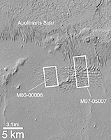 The field of parallel ridges north of the dune field (above the white boxes in picture at the left) is a wind-eroded material named the Apollinaris Sulci. It is possible that the dune field shown here was once covered by this wind-eroded material and was later exhumed. Regardless, the dunes were somehow hardened and have been exposed as hard rock on the martian surface long enough for many impact craters smaller than a few hundred meters (few hundred yards) across to form. These dunes are therefore quite ancient---one might say that this is a 'fossil' dune field. A similar effect at a much smaller scale can be seen by examining some sandstones and siltstones on Earth---if conditions were right, ripples formed in either water or wind are preserved in such rocks.