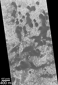 The picture above right shows the MOC image from December 1999 superimposed on a Viking 1 image taken May 27, 1978. During the 11 1/2 Mars years that passed between these two dates, it turns out that no difference can be detected in the position of the dunes seen in the MOC image and the Viking image. (Click Here for a view of the Viking Image without the MOC image). The earlier Viking image had a resolution of about 17 meters (56 ft) per pixel, while the MOC image had a resolution of about 3.8 meters (12 ft) per pixel. Although it looks like the dunes didn't move between the Viking and MOC images, this observation is limited by the resolution of the Viking image. It is entirely possible that the dunes have moved as much as 17-20 meters (16-66 ft) and one would not be able to tell by comparing the images. As it is, movement of less than 20 meters (66 ft) in 11 martian years (nearly 22 Earth years) is slower than some dunes of similar size and shape on Earth. Thus, it appears that martian dunes are not "experiencing" the level of activity commonly reported for some of the modern desert dunes found on Earth. The dune field illustrated in these pictures is located in a western Arabia Terra crater at 1.6°N, 351.6°W. Both the Viking and MOC images are illuminated from the left.