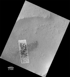 To look for evidence of dune movement on Mars, the Mars Global Surveyor (MGS) Mars Orbiter Camera (MOC) has been used to re-visit some areas of known barchan dunes---because these types move the fastest---that were observed by the Mariner 9 orbiter in 1972 and the Viking 1 and 2 orbiters between 1976 and 1980. The picture above, left, shows a MOC high-resolution image taken December 25, 1999. The classic, crescentic shape of the dark barchan dunes can be seen in this picture. The steep slopes, also known as the dune slip faces, on these dunes are facing toward the southwest (north is up in both pictures). Thus, the shape of the dunes indicates that they are moving toward the southwest.
