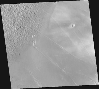 The regional view (above, left) is a MOC wide angle context image showing the location of the higher resolution, narrow angle camera view (above, right) as a small, white box. The upper left portion of the context image shows a rough, hilly terrain--Gigas Sulci--that is cut along its margins by several troughs that look something like gashes made by a giant knife. Also in this scene are several impact craters, inluding one (upper right) with a bright, teardrop-shaped "tail" formed by wind. The context frame covers an area approximately 115 kilometers (71 miles) across and is illuminated from the left. North is up.