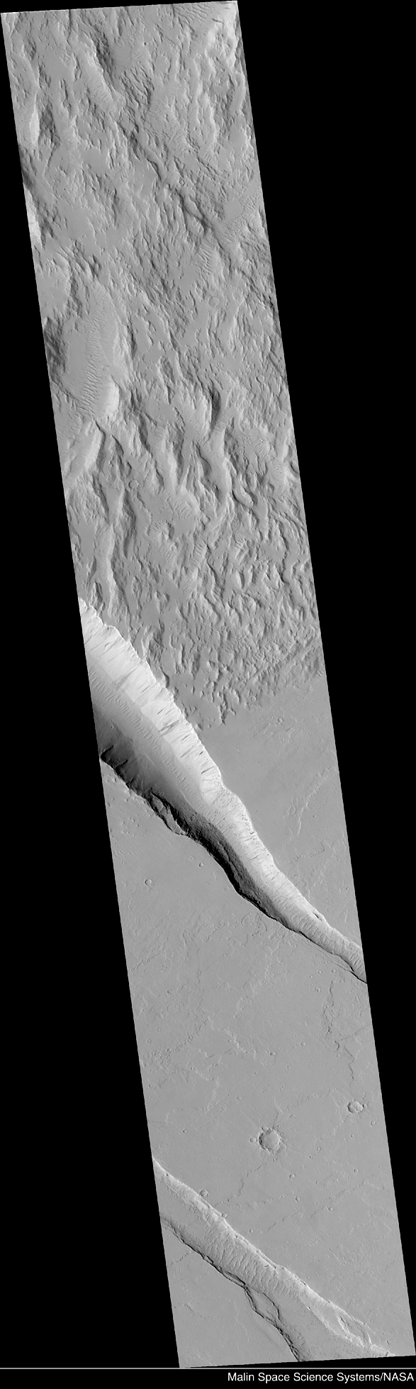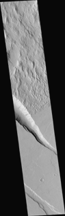 The high resolution picture (above, right) is a MOC narrow angle camera view of a 3 km-(1.9 mi)-wide area along the edge of the hilly, Gigas Sulci terrain. This image shows a range of interesting geologic features. The Gigas Sulci consist of steep, somewhat mountaintous terrain, but the valleys and some of the slopes between these hills appear smooth and mantled (perhaps by dust). Small, parallel ridges on some of the valley floors are probably windblown dunes. The edge of the hilly terrain is cut by a deep trough caused by faulting and down-dropping of the terrain in the center of the valley. The slopes of this valley exhibit dark streaks caused by small landslides. Boulders the size of small buildings can also be seen on some of these slopes. This deep trough and another, shallower one to the south (lower left) cut across lava flows, indicating that the troughs formed after the lava flows were emplaced, cooled, and hardened. The trough at the lower left has slumped and terraced walls. As in the context frame, north is up and the sun illuminates the scene from the left.