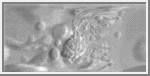 Proteus [PROH-tee-us], like all six of Neptune's newly discovered small satellites, is one of the darkest objects in the solar system -- "as dark as soot" is not too strong of a description. Like Saturn's satellite, Phoebe, it reflects only 6 percent of the sunlight that strikes it. Proteus is about 400 kilometers (250 miles) in diameter, larger than Nereid. It wasn't discovered from Earth because it is so close to Neptune that it is lost in the glare of reflected sunlight. Proteus circles Neptune at a distance of about 92,800 kilometers (57,700 miles) above the cloud tops, and completes one orbit in 26 hours, 54 minutes. Scientists say it is about as large as a satellite can be without being pulled into a spherical shape by its own gravity. Proteus is irregularly shaped and shows no sign of any geological modification. It circles the planet in the same direction as Neptune rotates, and remains close to Neptune's equatorial plane.