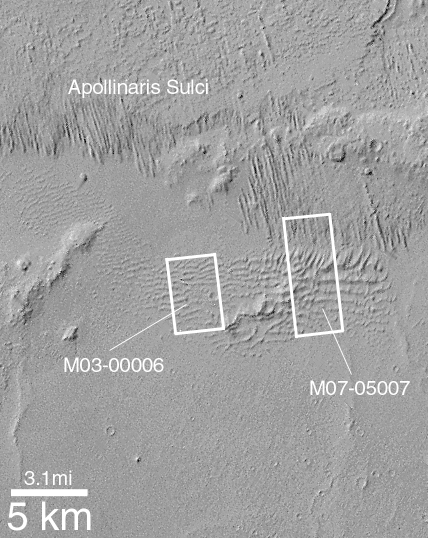 The field of parallel ridges north of the dune field (above the white boxes in picture at the left) is a wind-eroded material named the Apollinaris Sulci. It is possible that the dune field shown here was once covered by this wind-eroded material and was later exhumed. Regardless, the dunes were somehow hardened and have been exposed as hard rock on the martian surface long enough for many impact craters smaller than a few hundred meters (few hundred yards) across to form. These dunes are therefore quite ancient---one might say that this is a 'fossil' dune field. A similar effect at a much smaller scale can be seen by examining some sandstones and siltstones on Earth---if conditions were right, ripples formed in either water or wind are preserved in such rocks.