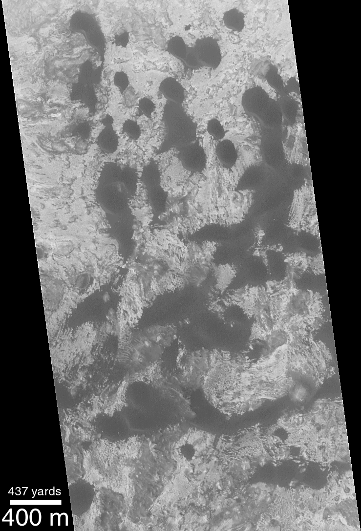 To look for evidence of dune movement on Mars, the Mars Global Surveyor (MGS) Mars Orbiter Camera (MOC) has been used to re-visit some areas of known barchan dunes---because these types move the fastest---that were observed by the Mariner 9 orbiter in 1972 and the Viking 1 and 2 orbiters between 1976 and 1980. The picture above, left, shows a MOC high-resolution image taken December 25, 1999. The classic, crescentic shape of the dark barchan dunes can be seen in this picture. The steep slopes, also known as the dune slip faces, on these dunes are facing toward the southwest (north is up in both pictures). Thus, the shape of the dunes indicates that they are moving toward the southwest.