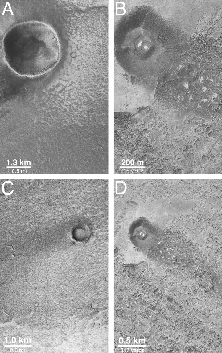 At the Amboy lava field in California, bright sand is being blown across the dark lava from adjacent dry streambeds. When this sand encounters a volcanic cinder cone that rises above the lava field (pictures "B" and "D" in the above, right figure), the sand is deflected around the cone and leaves a dark "shadow" in which very little bright sand gets deposited. A similar situation is seen with respect to craters formed by meteor impact in the Daedalia Planum image AB1-10905 (pictures "A" and "C" in the above, right figure). The spectacular Amboy wind streak, lava flows, and cinder cone can often be seen from an airplane by passengers flying into or out of Los Angeles International Airport (LAX) from points east such as Denver, Colorado.