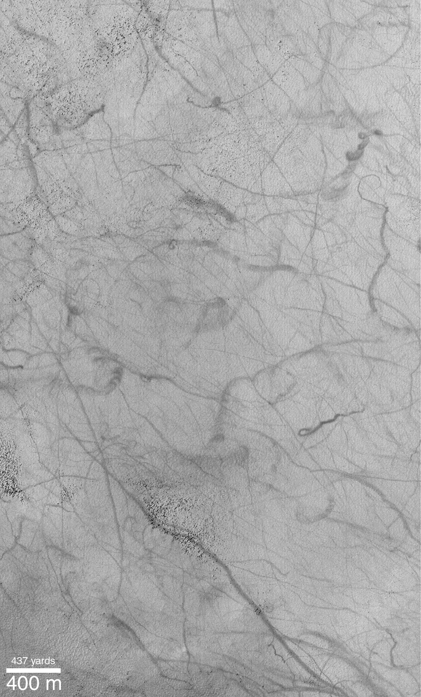 Dark streaks, everywhere! Many Mars Global Surveyor (MGS) Mars Orbiter Camera (MOC) images of the middle latitudes of the northern and southern hemispheres of Mars show wild patterns of criss-crossing dark streaks. Many of these streaks are straight and narrow, others exhibit curly arcs, twists, and loops. They often cross over hills, run straight across dunes and ripples, and go through fields of house-sized boulders. The two examples shown above were acquired in the last three months. Both pictures are illuminated by sunlight from the upper left. The first picture (left), showing dark streaks on the rippled flats of Argyre Planitia, covers an area 3 km by 5 km (1.9 by 3.1 miles) at a latitude of 51°S. The second picture (right) shows an area approximately 3 km by 5 km in Promethei Terra at a latitude of 58°S.