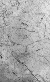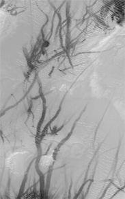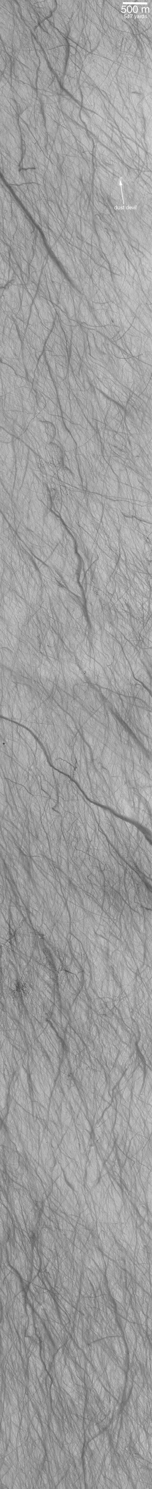 The fourth picture (above, right) shows a surface in southwestern Terra Sirenum near 63°S, 168°W, that has seen the activity of so many dust devils that it looks like a plate of dark gray spaghetti. This image, taken in early summer during February 2000, covers an area 3 km wide and 30 km long (1.9 by 19 miles). In fact, a dust devil can be seen in the upper right of this image. Like the other pictures shown here, the Terra Sirenum image is illuminated by sunlight from the upper left.