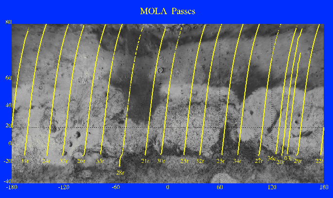 Locations of topographic profiles obtained by the Mars Orbiter Laser Altimeter (MOLA) while the Mars Global Surveyor spacecraft was in a 35-hour orbit around Mars. The tracks are overlain on a Viking image mosaic of the northern hemisphere of Mars. The MOLA instrument collected data from altitudes less than 470 miles (~750 km), which resulted in profiles of topography in the north-south direction as the instrument ranged for approximately 22 minutes during each orbit. Track numbers correspond to the number of spacecraft periapse, the point of spacecraft closest approach to Mars in a given orbit. (Credit: MOLA Science Team)