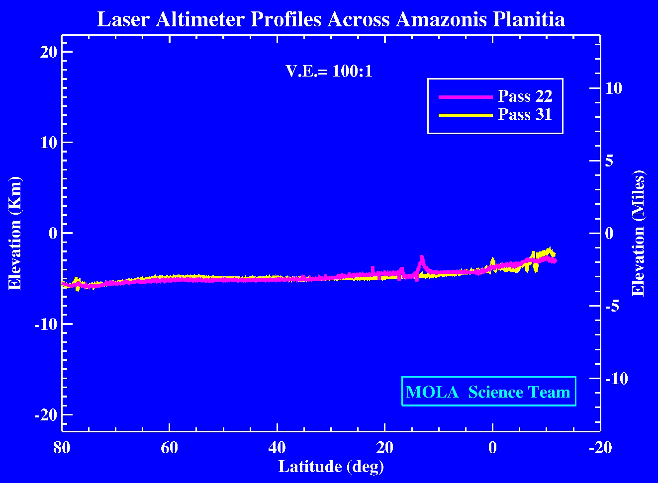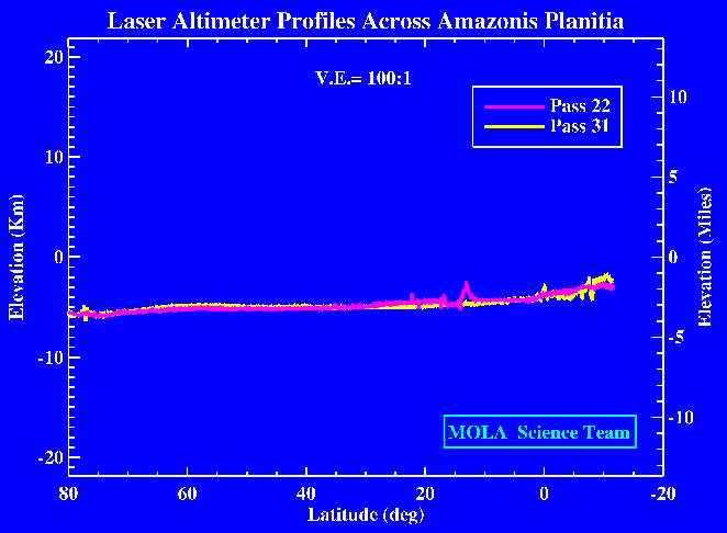 MOLA topographic profiles across the Amazonis Planitia region of the northern hemisphere of Mars. The profiles, obtained during spacecraft periapsis passes 22 and 31, are approximately 3200 miles (~5500 km) long and span the latitude range 80°N to 12°S. The profiles are 725 miles (1160 km) apart, yet show very similar long wavelength elevation distributions. The change in elevation over a distance nearly the width of the United States is approximately 3200 feet (1 kilometer), corresponding to a slope of approximately 1/50°. These and other MOLA profiles confirm that the extreme flatness of the northern hemisphere shown in the first MOLA profile, obtained on periapse pass 3, characterizes Mars in the east-west direction as well as the north-south direction. The spatial resolution of the profiles is approximately 1000 feet (330 meters) and the vertical resolution is approximately 16 inches (40 centimeters). The vertical exaggeration in the plot is 100:1. (Credit: MOLA Science Team)