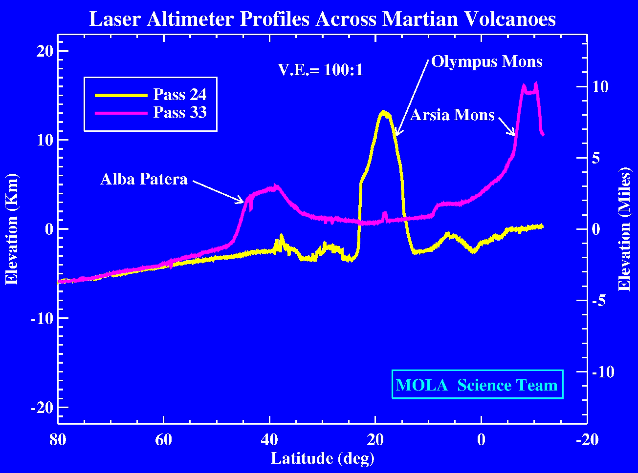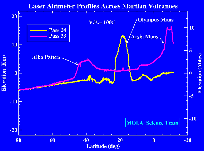 The MOLA instrument sampled several major shield volcanoes in passes across the massive Tharsis province in Mars northern hemisphere. Pass 24 shows Olympus Mons, the largest known volcano of the solar system, with a diameter of 400 miles (650 km). The altimeter reveals approximately 10 miles (17 km) of relief associated with the volcano, however, because the instrument did not sample the structure across the summit the maximum height is expected to be approximately 16 miles (25 kilometers). Profile 24 delineates the collapse of the northern (left) flank of the volcano to form a rugged aureole deposit. Pass 33 shows the Alba Patera and Arsia Mons volcanic structures, the latter of which lies close to the highest point of the topographic rise that defines the Tharsis province. These two profiles show the greatest topographic elevations that have so far been sampled by the MOLA instrument. The spatial resolution of the profiles is approximately 1000 feet (330 meters) and the vertical resolution is approximately 16 inches (40 centimeters). The vertical exaggeration in the plot is 100:1. (Credit: MOLA Science Team)