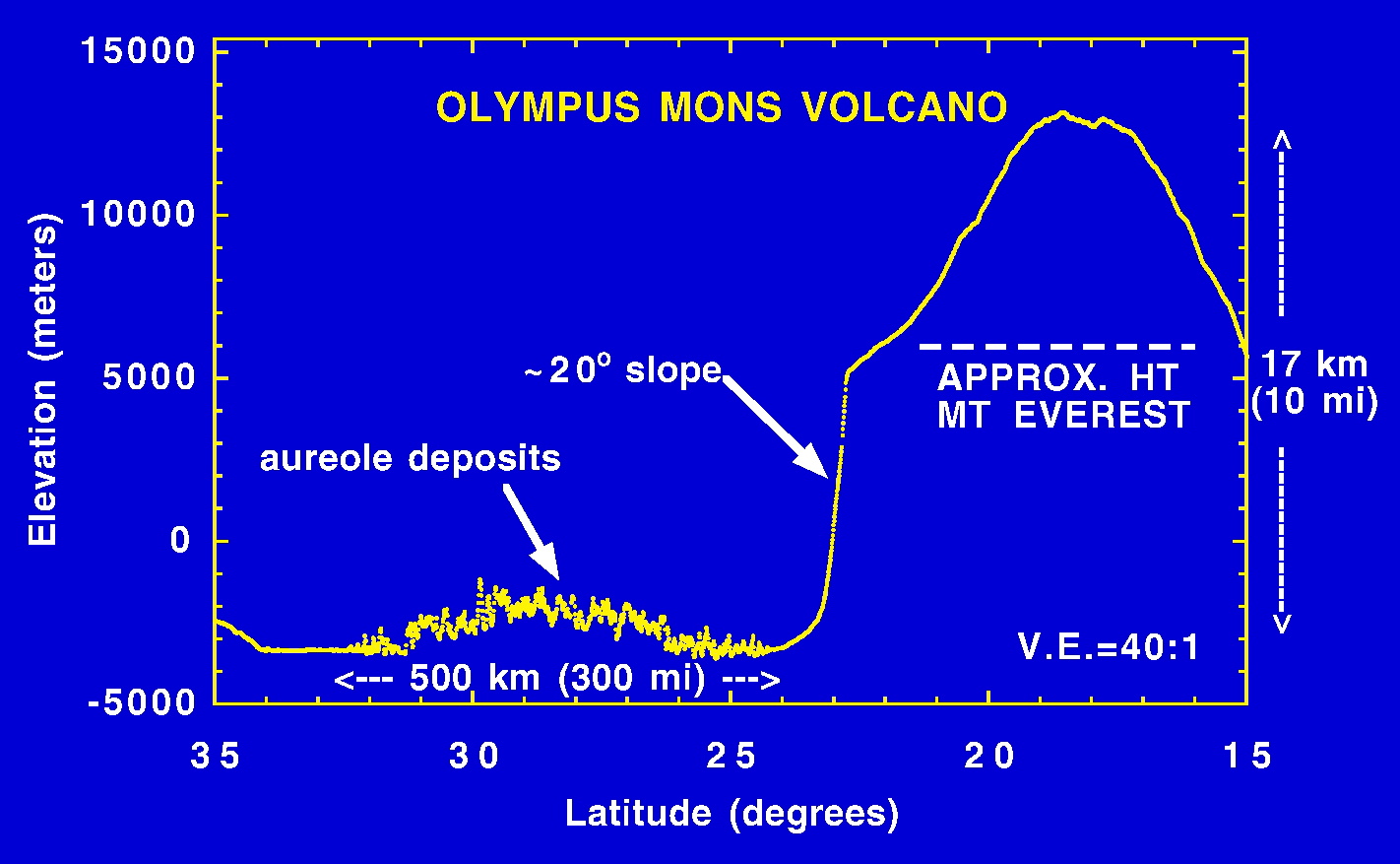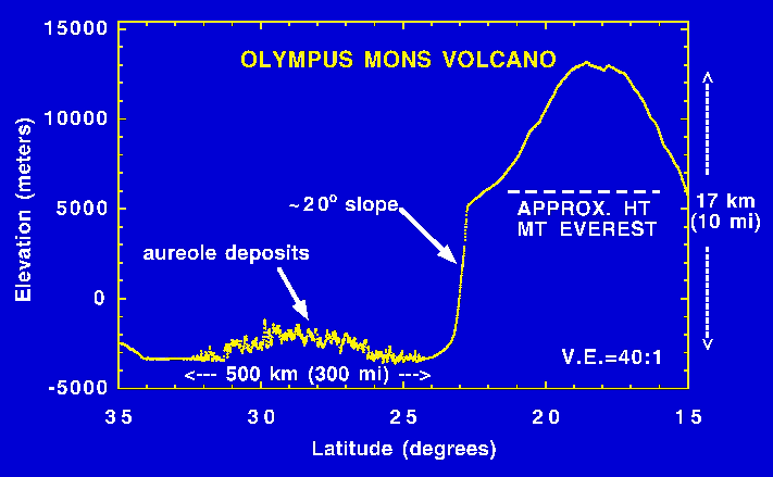 This figure shows the cross-sectional relief of the Olympus Mons shield volcano as measured by the Mars Orbiter Laser Altimeter (MOLA). The profile was collected by the Mars Global Surveyor spacecraft while in a 35-hour long elliptical orbit, during periapsis pass 24. Olympus Mons, the largest known volcano in the solar system, has a diameter of approximately 400 miles. This profile missed the volcano summit, but indicates that the full dynamic height of the volcano should be about 16 miles (25 kilometers). For comparison, Mount Everest, the highest mountain on Earth, is less than half the height of Olympus Mons. The profile shows the north flank of the volcano, which has collapsed and formed a rugged aureole nearly 300 miles across. The detailed topography provided by MOLA will be used to understand the mechanism for the collapse. The spatial resolution of the profile is approximately 1000 feet (330 meters) and the vertical resolution is approximately 16 inches (40 centimeters). The vertical exaggeration in the plot is 40:1. (Credit: MOLA Science Team)