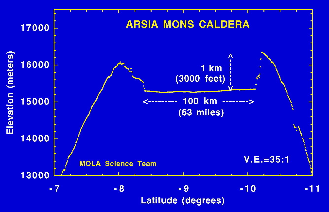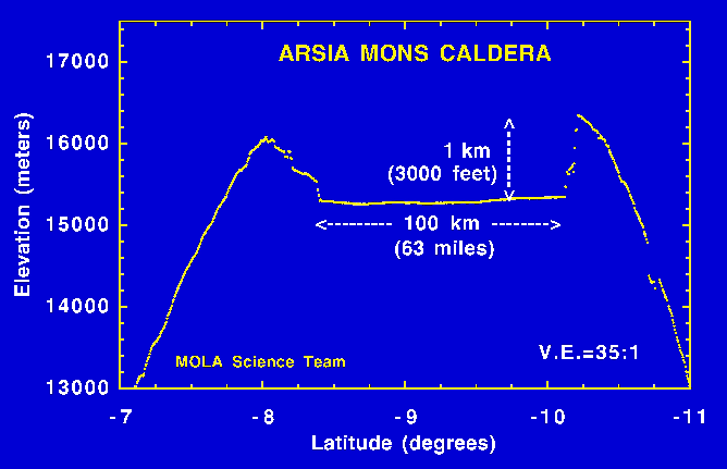 On periapse pass 33 of the 35-hour long Mars Global Surveyor elliptical orbit, the Mars Orbiter Laser Altimeter (MOLA) collected a topographic profile across the summit caldera of the Arsia Mons shield volcano. The caldera formed by collapse of the surface due to depressurization and/or evacuation of the near-surface magma storage chamber. The caldera is approximately 63 miles (100 km) across and about 3000 feet (1 kilometer) deep. For comparison the entire Los Angeles basin would fit within the structure. The detailed topography provided by MOLA will be used to constrain models which address the dynamics of magma eruption for Arsia Mons and other Martian volcanoes. The spatial resolution of the profile is approximately 1000 feet (330 meters) and the vertical resolution is approximately 16 inches (40 centimeters). The vertical exaggeration in the plot is 35:1. (Credit: MOLA Science Team)